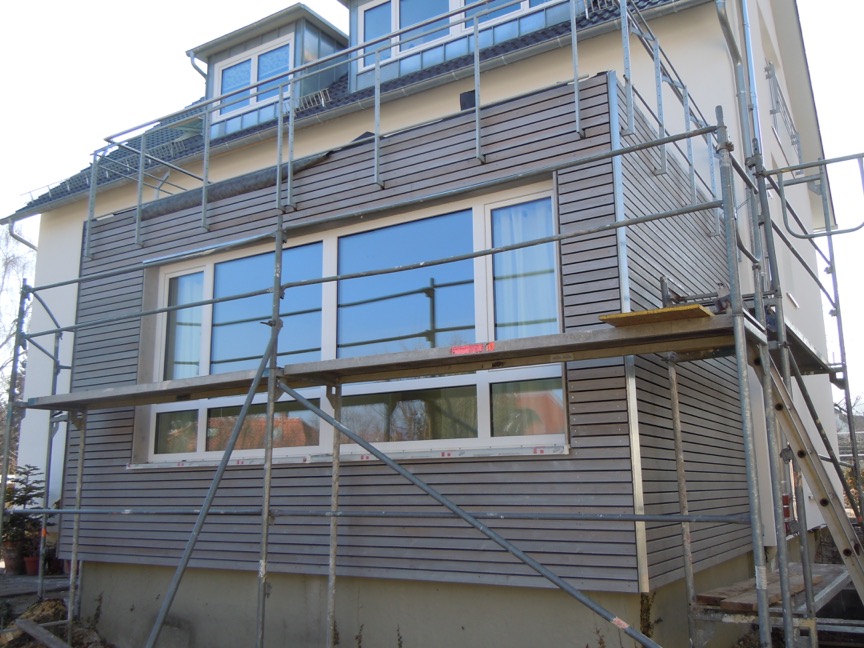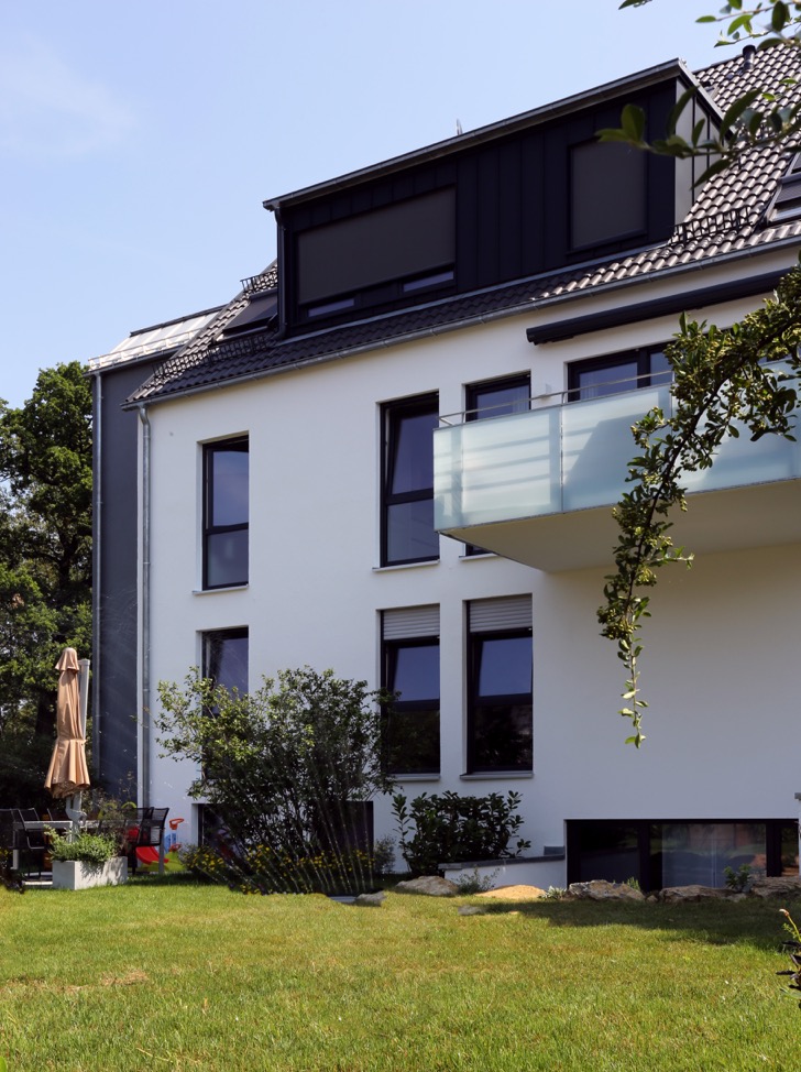 UMBAU MFH Südwestansicht / Straßenansicht Neue Balkone und Gaupen Das bestehende Wohngebäude mit Keller wurde im EG und 1.OG entkernt, der Dachstuhl mit Walmdach abgebrochen und als Satteldach neu erstellt. Fassade, Anbau und Fensteröffnungen wurden neu entworfen und zusammen mit einer energetischen Sanierung der Fassade umgebaut.