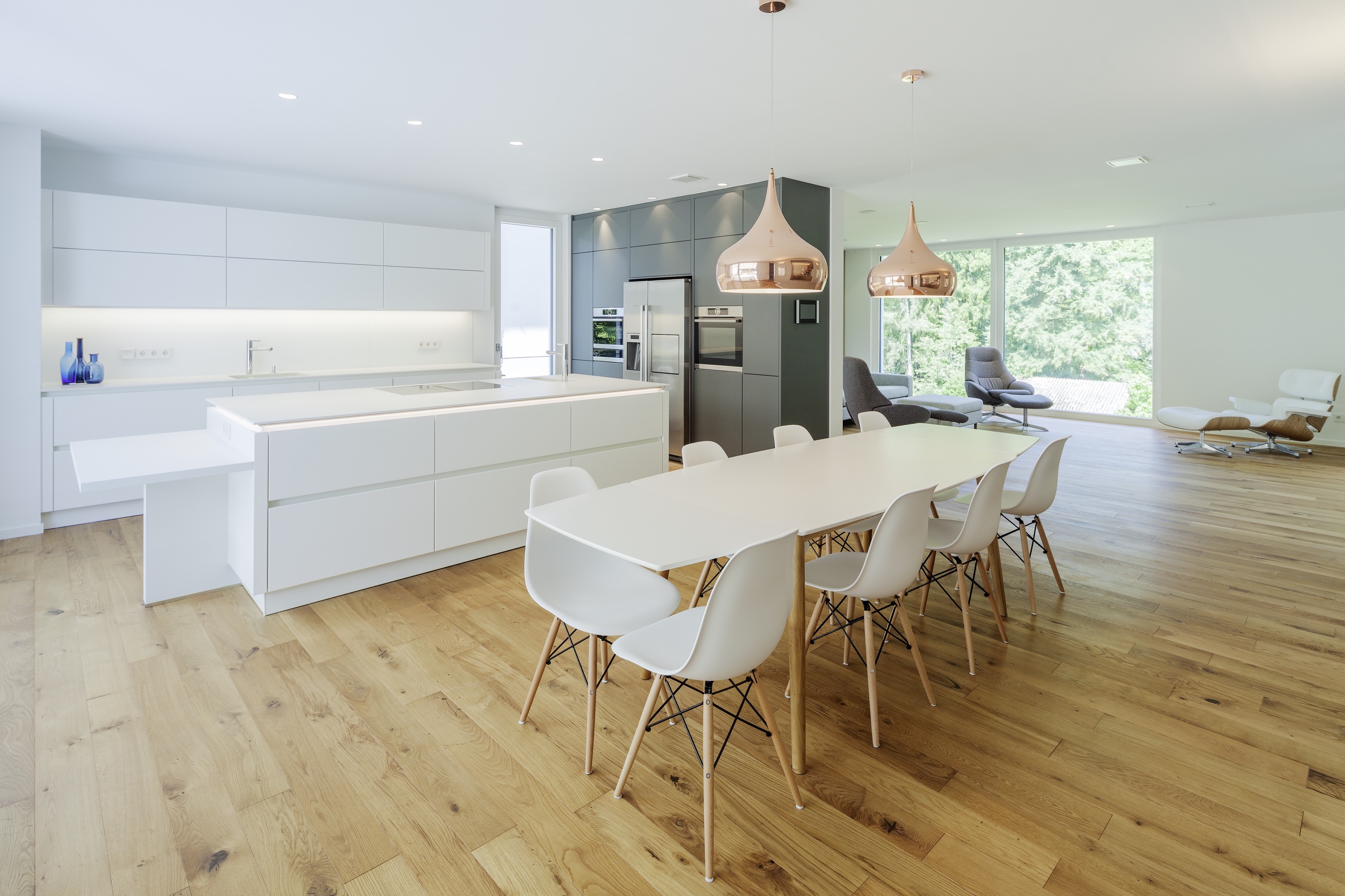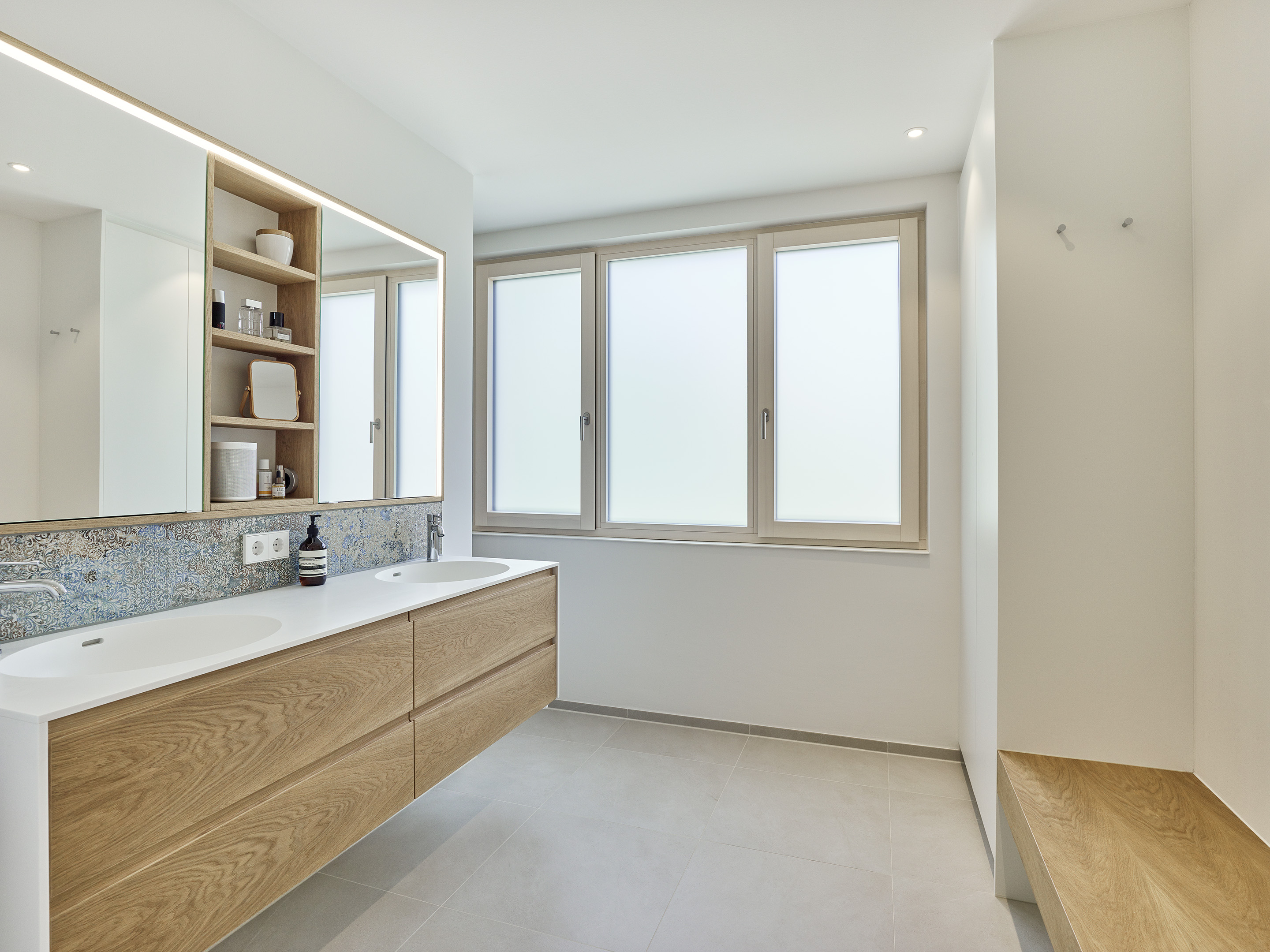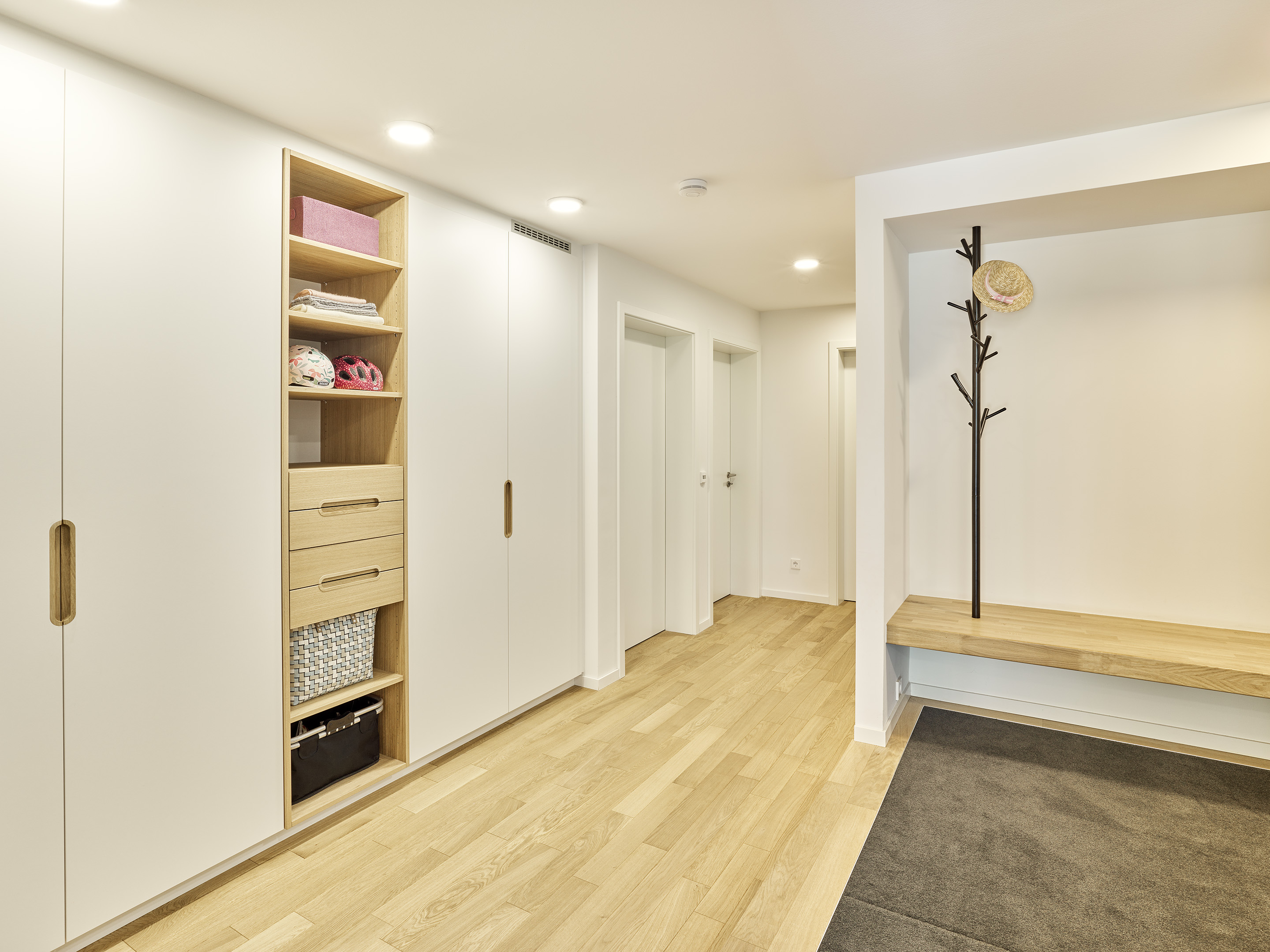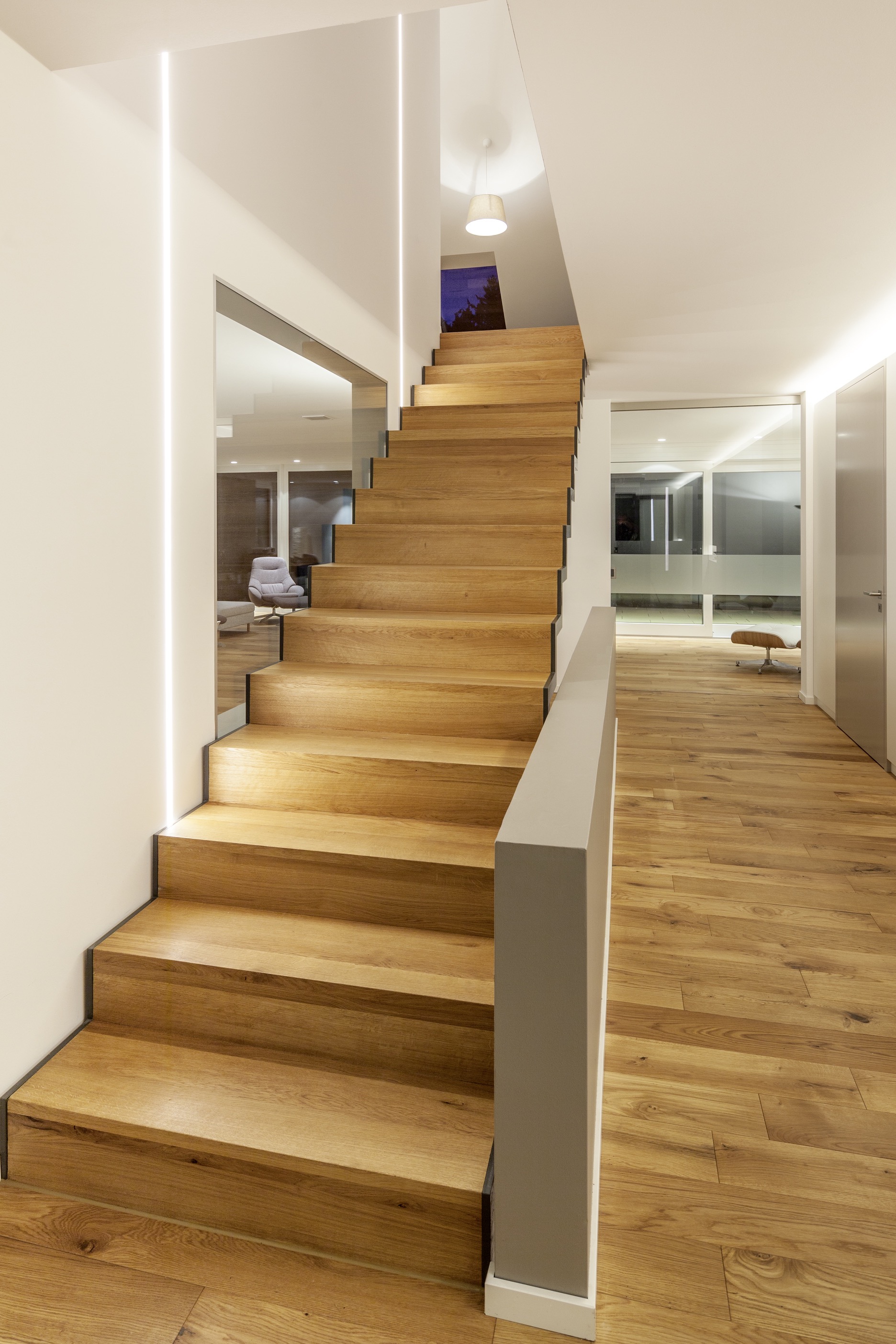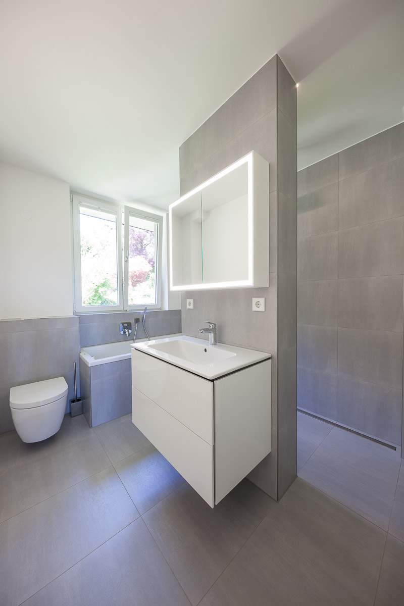 Villa Beutelsbach. Umbau, Sanierung und Innenausbau einer Villa, Beutelsbach. In erfolgreicher Zusammenarbeit mit der Stuttgarter Firma WEST.designbau GmbH wurde eine ehemalige Fabrikantenvilla unterhalb der Weinberge in Beutelsbach grundsaniert und umgebaut. Die Wirkung des modernen, in Teilen fast luxeriösen, Innenausbaus wird durch die großzügig geplanten Räume gesteigert, die fließend ineinander übergehen. Im Dachgeschoss befindet sich ein gemeinsamer Schlaf- und SPA-Bereich und ein begehbares Ankleide- und Schrankzimmer. Im Zentralgeschoss sind neben einem großzügigen Wohnküchenbereich mit vorgelagerter Aussichtsterrasse das Arbeits- und Gästezimmer zu finden. Das am ehemaligen Weinberghang erbaute Gebäude, überzeugt außerdem im Gartengeschoss mit einem Schwimmbad mit Saunabereich, einem Loungebereich und einem offenen Kamin, sowie dem Bewirtungsraum „Rittersaal“. Technikräume und Garage sowie Einliegerwohnung, sind jeweils mit Zugang zum idyllisch vorgelagerten Gartenbereich versehen.